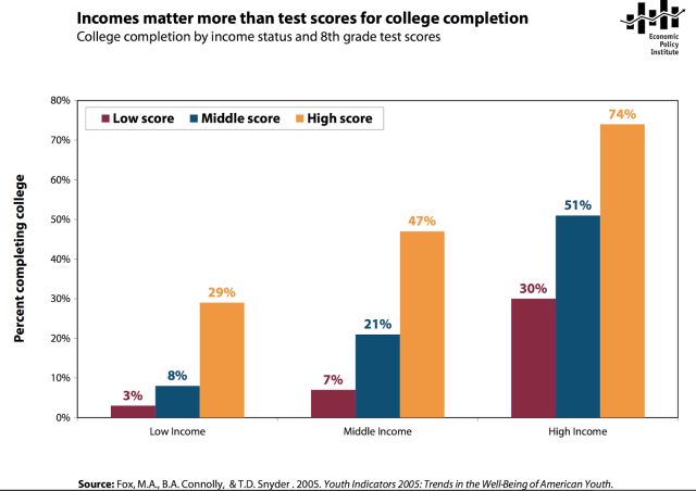 To judge for yourself whether inequality matters, just take a look at this comparison of what happens in college completion for the best scoring of low income kids vs. the lowest scoring high income kids. What happens is that 29% of the low income kids with highest scores complete college, while just about the same percentage (30%) of high income kids with low scores complete college. How can this be right?