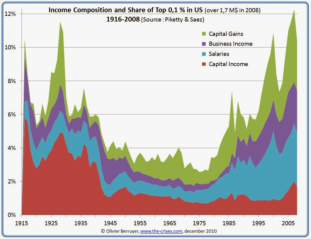 Bundling these loans up and securitizing them into tranches with suggested levels of risk and return (sometimes called “financial weapons of mass destruction–WMD’s”) is what led to the start of the economic depression beginning in 2008. The rights of big banks to trade for their own account in these kinds of instruments was just what Dodd-Frank was created to eliminate. The rider to the omnibus bill, added by Republicans, weakened that protection to American bank investors and taxpayers substantially. These protections are not wasted regulation like those cited above. They are important. Republicans have scuttled them with their amendments to the omnibus bill. In the meantime, it is hard to find a segment of capitalism in which executives are paid more than in the financial sector. Jamie Dimon of Chase was paid $20 million for 2013, notwithstanding trading losses of $6 billion a year earlier and fines for $1 billion in 2013. - No matter what one believes to be the cause (s) of our high inequality, Republicans have done virtually nothing to try to restrain it across the last 30 years, unless one gives credit to attempts to strengthen the private sector vs. workers, in order to raise growth–the “trickle down” approach. But as we know from the last 30 years with steadily rising inequality, there hasn’t been any trickle down. We still have 45 million Americans categorized as in poverty in the US and wages of the middle class have hardly moved. Jobs have become insecure.